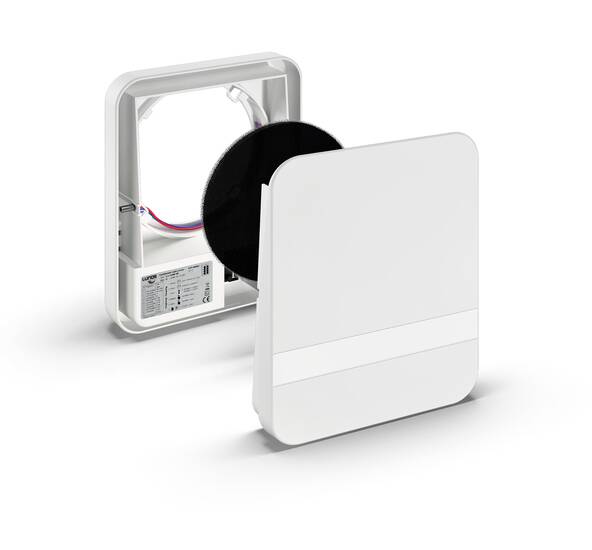 Die Montage ist besonders benutzerfreundlich: Ein einziges Kabel für den direkten Anschluss an 230 V, 50 Hz genügen, um die volle Funktionalität zu gewährleisten. Die Blende verfügt über einen 4-stufigen Drucktaster an der Seite, um bei Bedarf manuell in das Lüftungsverhalten eingreifen zu können sowie einen Steckplatz für das EnOcean Funkmodul UNI-EO zur Smart Home Anbindung. Zudem kann die Funkblende mit einem einfachen Klappmechanismus verschlossen werden.